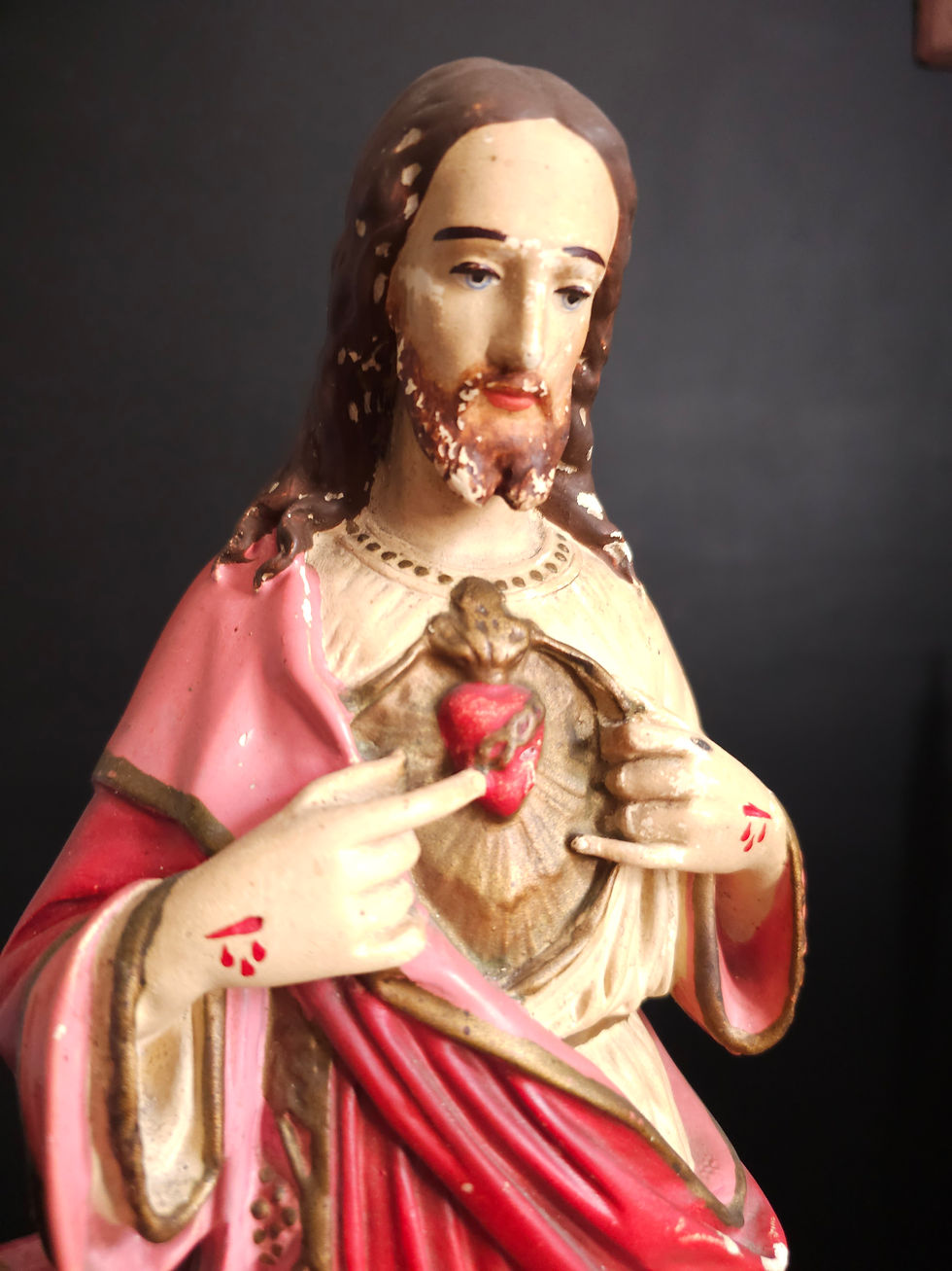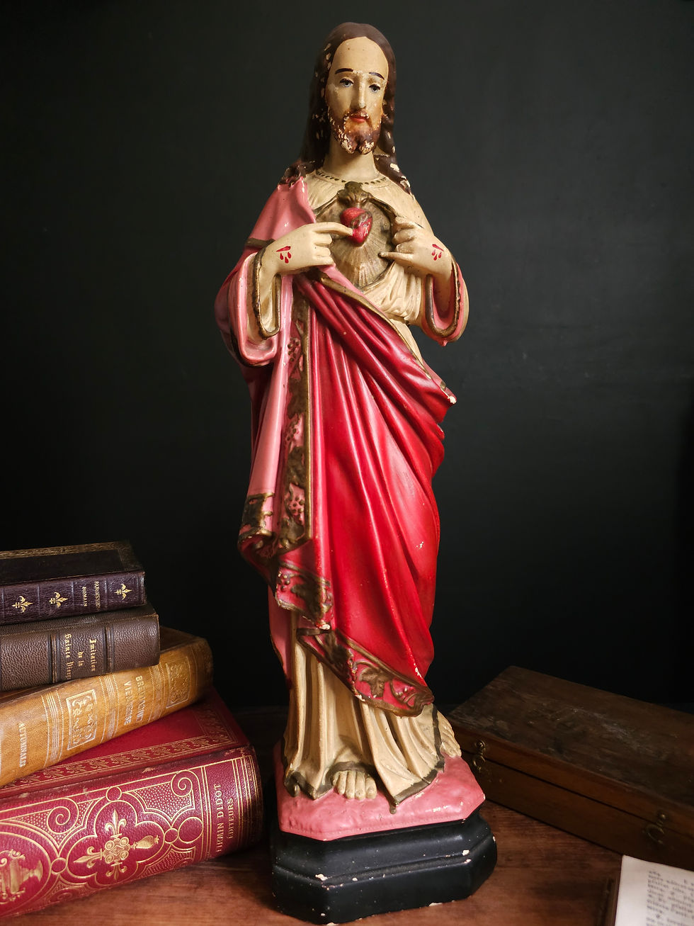 Statue en plâtre polychrome du Sacré-Cœur de Jésus fabriquée en France