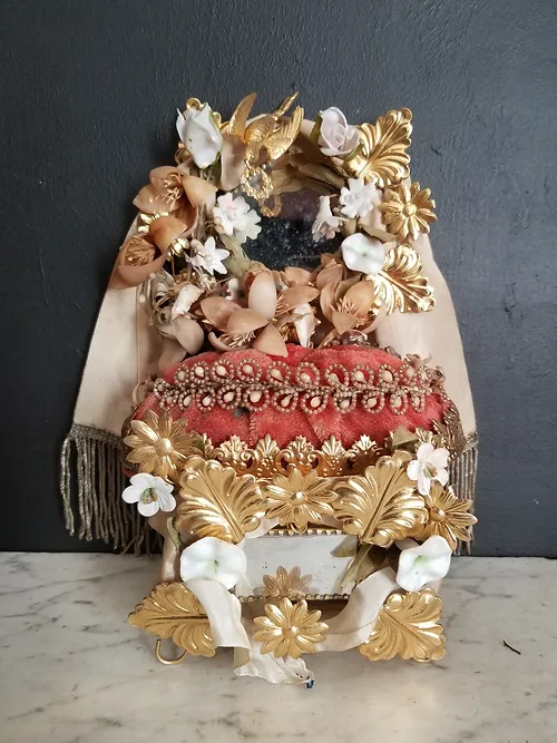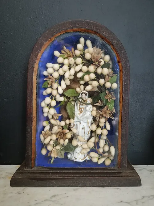 Over the years other special items were added, photographs, little locks of their babies hair, jewelry. The end result is a physical record of all the wishes and dreams of marriage. Before 1850, regional differences were marked: seashells in the north and north west, flowers in the south. As with most fashions, local variations were slowly ironed out. By 1880 they could be bought in store catalogs in different styles and different price points. By 1920 Lamotte of Paris offered seven types of Globe, but by this stage the fashion was fading as modernity finally began to sweep across France. By the time of the economic crisis in 1929, the trend had run its course and by the war it was almost already forgotten.