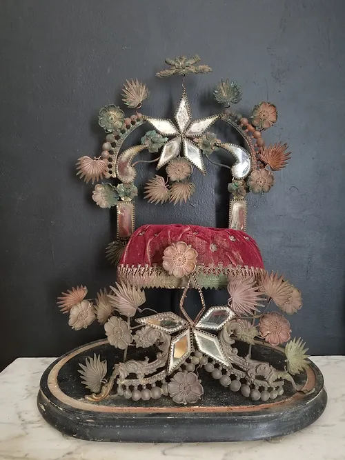 Which leads us to the present day. To find an intact globe with all its internal components is rare but not unfeasible. But over time, the thin glass cracks, the porcelain flowers shatter and the mirrors tarnish. More often than not we'll find bits of the globe, sometimes just a faded cushion with the ormolu decoration. The part I find most beautiful (and I fully admit it touches my romantic side) is the crown itself. Floral crowns have a deep long history stretching back to Ancient Greece. A Globe de Mariée would usually have a crown of orange blossom - the tree blossoms and bears fruit as the same time and the symbolism for a marriage is obvious. It seems accepted that they gained popularity in Europe after Queen Victoria wore one to her wedding in 1840. Real orange blossom flowers are obviously quite expensive so most brides would wear version in wax, wire and cloth. From 1892 a major centre of manufacture in France was at Briere in Loire Atlantique. The factory has gone but you still take classes to make your own. Obviously there were regional differences too. In Bretagne, the crown could also be a full garland and the groom would also wear them.